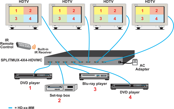 The SPLITMUX® 4x4 HDMI Quad Screen Multiviewer is a multi-purpose high-speed video processing system that can be configured for three different output modes. In Multiview Mode, it is capable of displaying the four video sources in quad, PiP, full screen, or custom display modes, with all four monitors simultaneously displaying the same image. In Matrix Mode, digital HDMI video and audio signals are routed from four HDMI video sources to four displays. In Video Wall Mode, video from a single source is displayed across all four monitors.