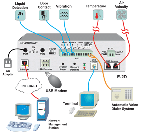The ENVIROMUX® Small Enterprise Environment Monitoring System (EMS) monitors critical environmental conditions (such as temperature, humidity, and water leakage) that could destroy network components in your server room. When a sensor goes out of range of a configurable threshold, the system will notify you via email, SNMP traps, web-page alerts, a visual indicator (red LED), voice phone calls (via Automatic Voice Dialer System), and SMS messages (via email-to-SMS or external USB modem).
