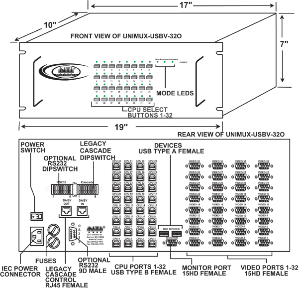 The UNIMUX™ VGA USB KVM Switch allows a user to control up to 32 USB computers with one USB keyboard, USB mouse and VGA monitor. Dedicated internal microprocessors emulate keyboard & mouse presence to each attached CPU 100% of the time so all computers boot error-free.
